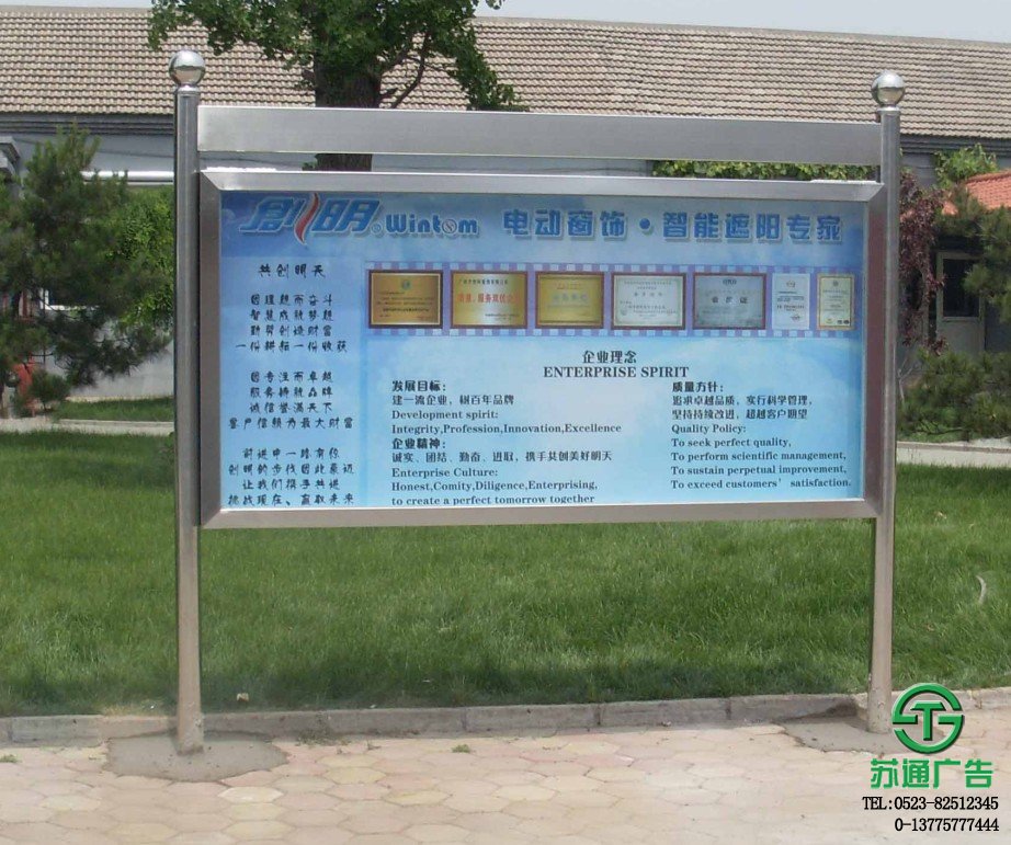 鋼板和不銹鋼板的公告欄會(huì)采用鋼板烤漆的工藝,表面進(jìn)行防腐處理??陕裼诘孛嬉韵拢部捎门蛎浡萁z固定在硬化地板表面。為了遮擋陽(yáng)光和雨水,宣傳欄一般會(huì)有頂棚。